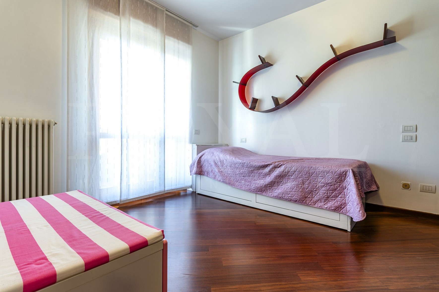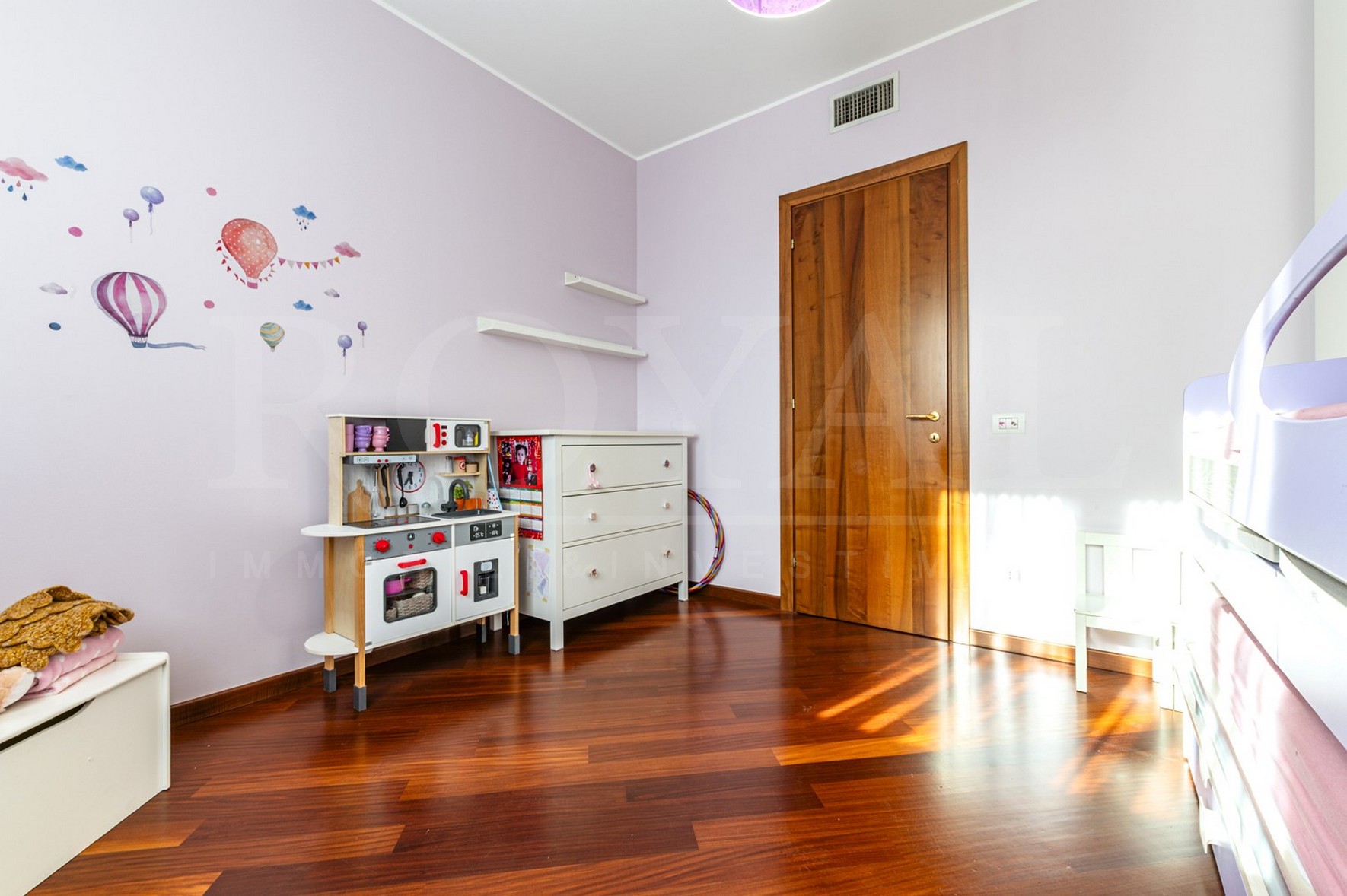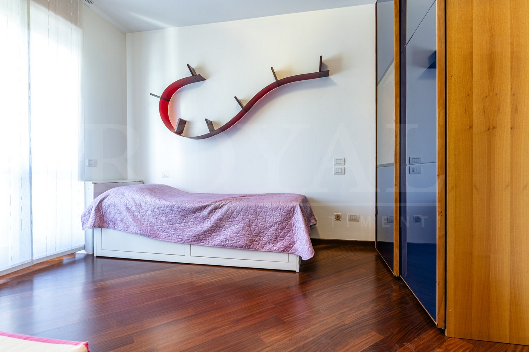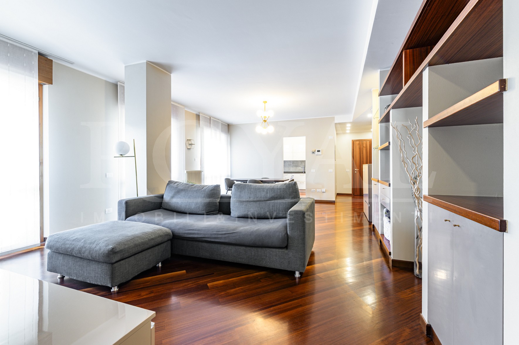 Internamente l’immobile è composto da: ingresso, ampio e luminoso soggiorno con vetrate che consentono l’accesso diretto al terrazzo, ripostiglio, cucina abitabile con balcone di servizio, disimpegno, tre camere da letto di cui una con balcone e doppi servizi entrambi finestrati.