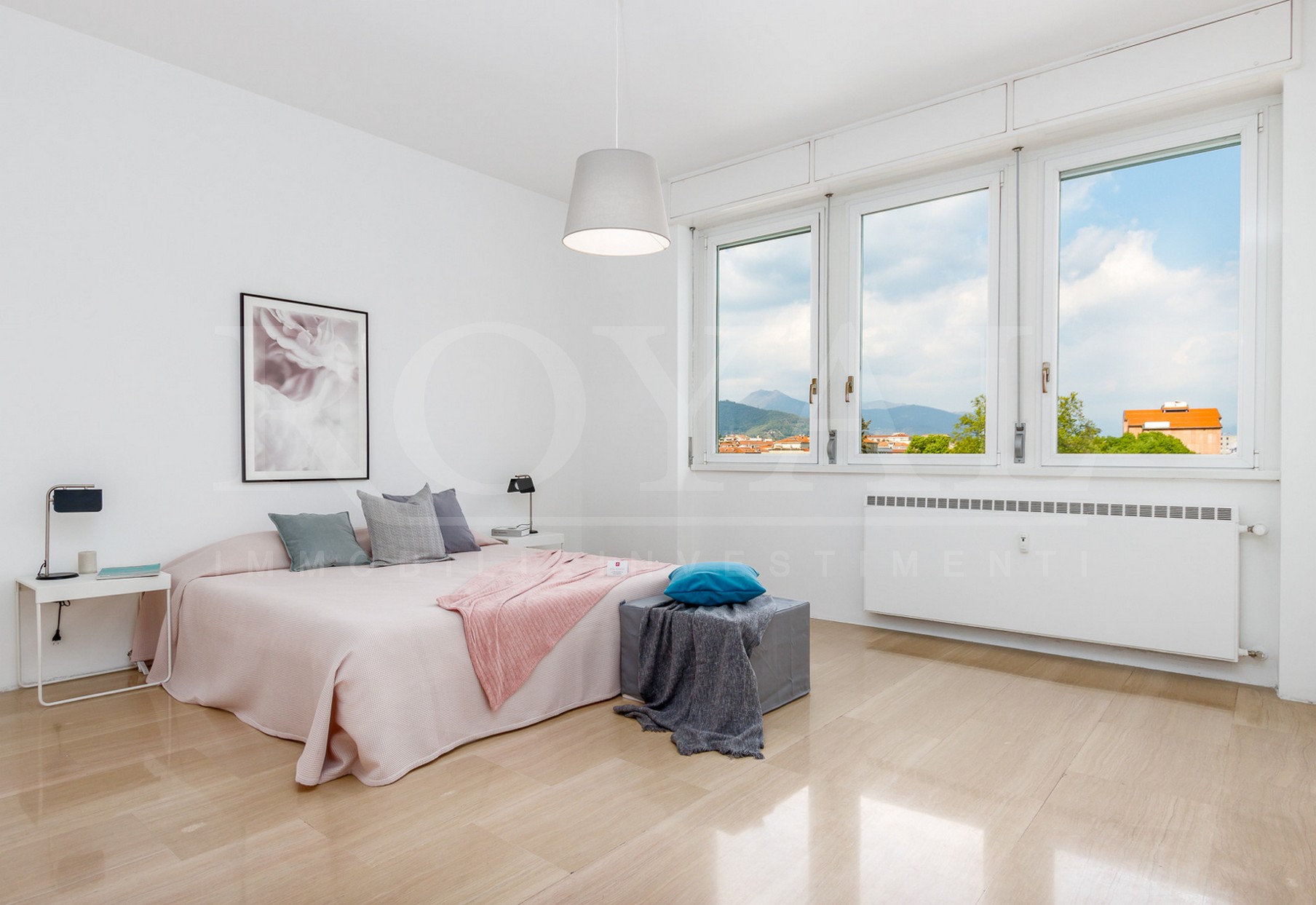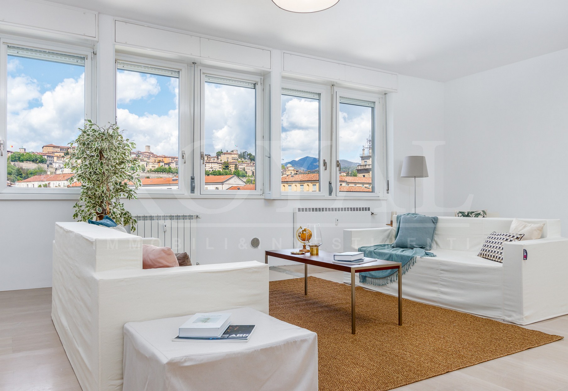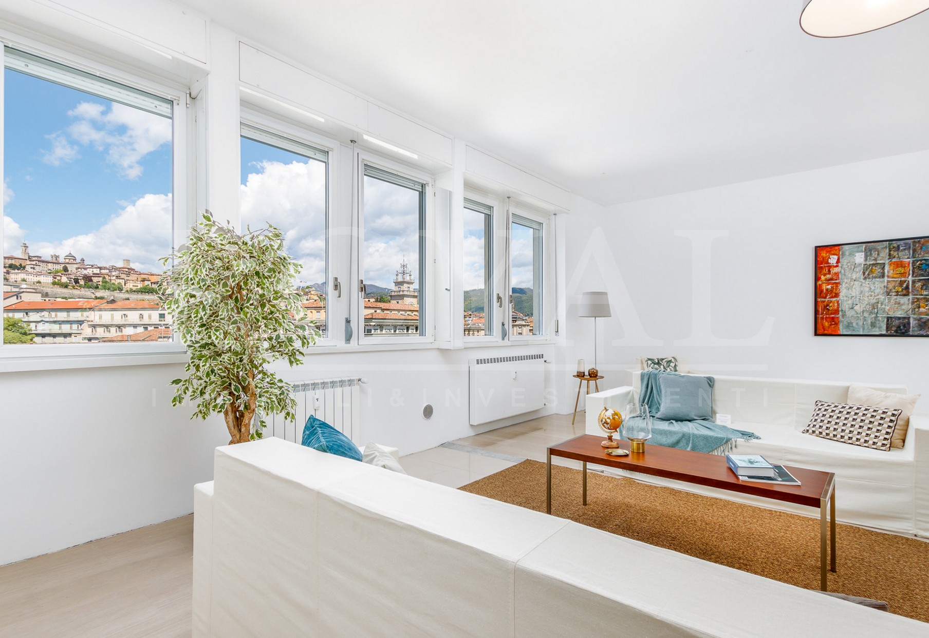 L'immobile, posto al quinto e sesto piano e servito da ascensore, internamente è composto da: ingresso, ampio e luminoso doppio soggiorno, cucina abitabile, disimpegno, quattro camere da letto e tre bagni finestrati. Il sesto ed ultimo piano, al quale si accede tramite una scala interna, gode di una vista esclusiva ed impareggiabile su Città Alta ed è caratterizzato da ampie vetrate che conferiscono luminosità agli ambienti, internamente è composto da: spaziosa e luminosa zona living, ulteriore locale fruibile come studio/camera e bagno.